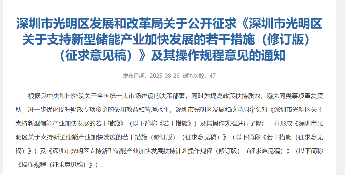 8月26日,深圳光明区发改局在官网发布了《关于公开征求《深圳市光明区关于支持新型储能产业加快发展的若干措施(修订版)(征求意见稿)》及其操作规程意见的通知》(以下简称《通知》)。