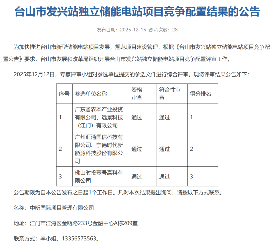12月15日,广东台山市发展和改革局发布台山市发兴站独立储能电站、台山市阁安站独立储能电站两个项目竞争配置结果的公告。两个项目规划装机容量均为200MW。