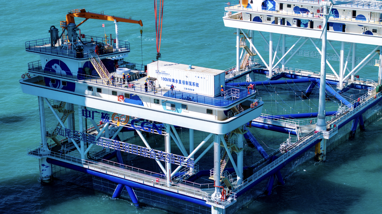 2024年12月23日,中广核可再生能源孤网海水直接制氢系统正式启动海上试验。中广核海上技术研究中心主任冯茹鸣介绍,汕尾实验平台套建设了50千瓦风电、18千瓦光伏发电以及200千瓦时储能设备,实现风光储耦合的孤网运行模式。中广核制氢系统利用汕尾实验平台的配套电源,在平台上直接使用海水制氢。