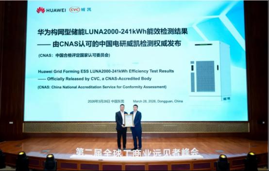 【中国,东莞,2026年3月28日】华为工商业构网型储能LUNA2000-241系列能效检测结果发布,额定能量效率(类同RTE)试验和24小时综合能效(2充2放)试验两项核心指标均由中国电研威凯检测完成测试,标志着华为工商业构网型储能领域技术的领先性再获专业第三方检测机构见证。